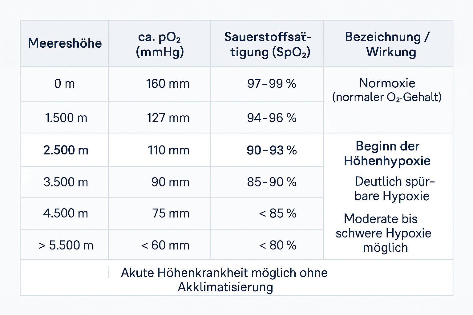 Unter Hypoxie versteht man eine Sauerstoffunterversorgung. Also einen Sauerstoffanteil in unserer Atemluft von weniger als 21%. Wir begegnen ihr in größerer Höhe, beim Bergsteigen ebenso wie bei einer Fahrt mit dem Heißluftballon, Segelfliegen oder Paragleiten. Bereits aber einer Höhe von 1000 HM gilt es die reduziert vorhandenen Sauerstoffanteil zu berücksichtigen. Menschen die in größere Höhen leben (z.B. Bergdörfer oder Himalaya) sind somit einer dauerhaften Hypoxie ausgesetzt.